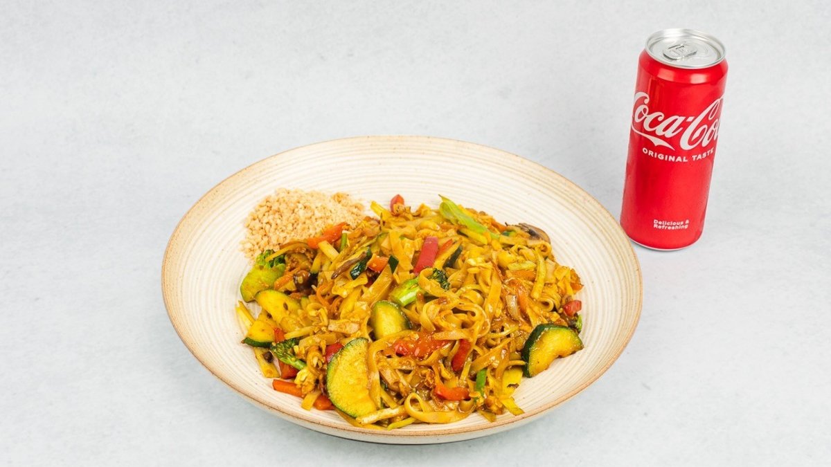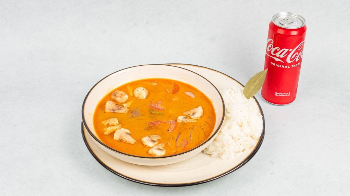 Curry z indijskimi oreščki, glavna sestavina po izbiri, riž, sladka omaka Dodatek: pijača po izbiri