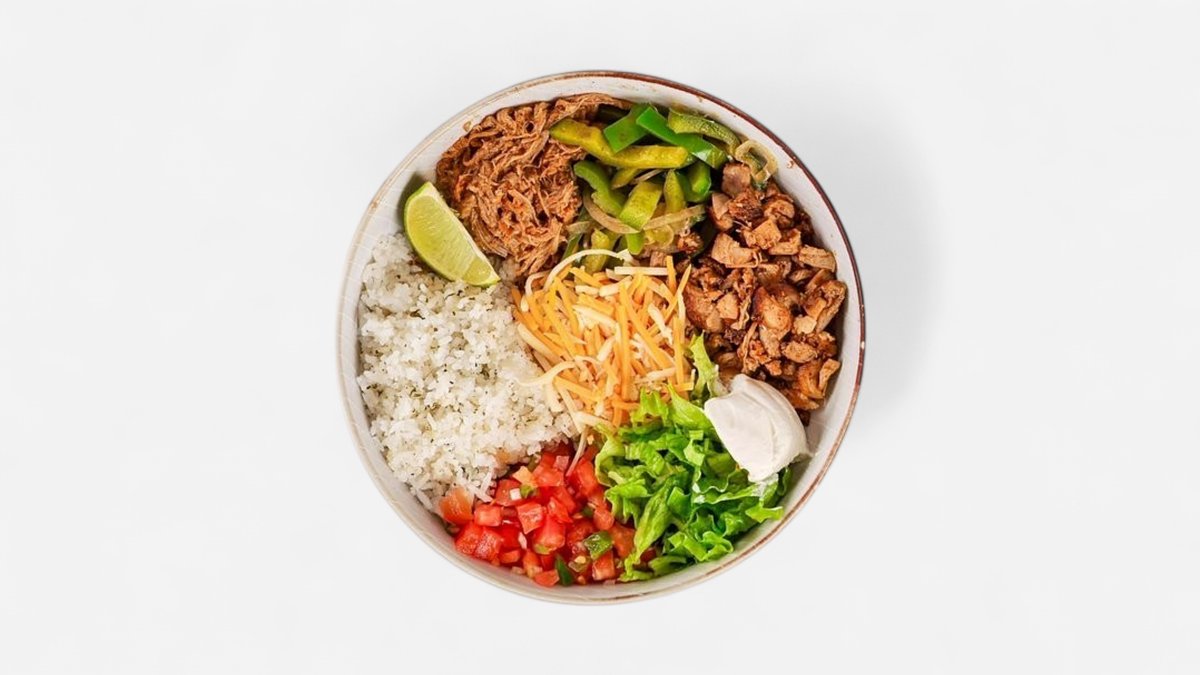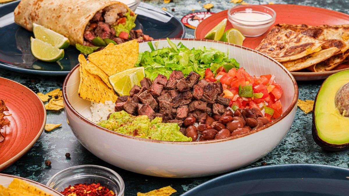Riž, fižol, piščančje stegno na žaru, natrgana svinjina (carnitas), žar zelenjava (fajitas), svež paradižnik z limeto (pico de gallo), rdeča salsa 🔥, nariban sir, kremna omaka z limeto, solata