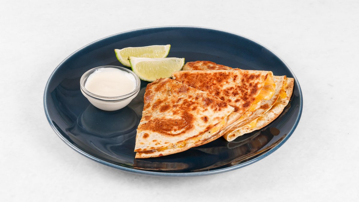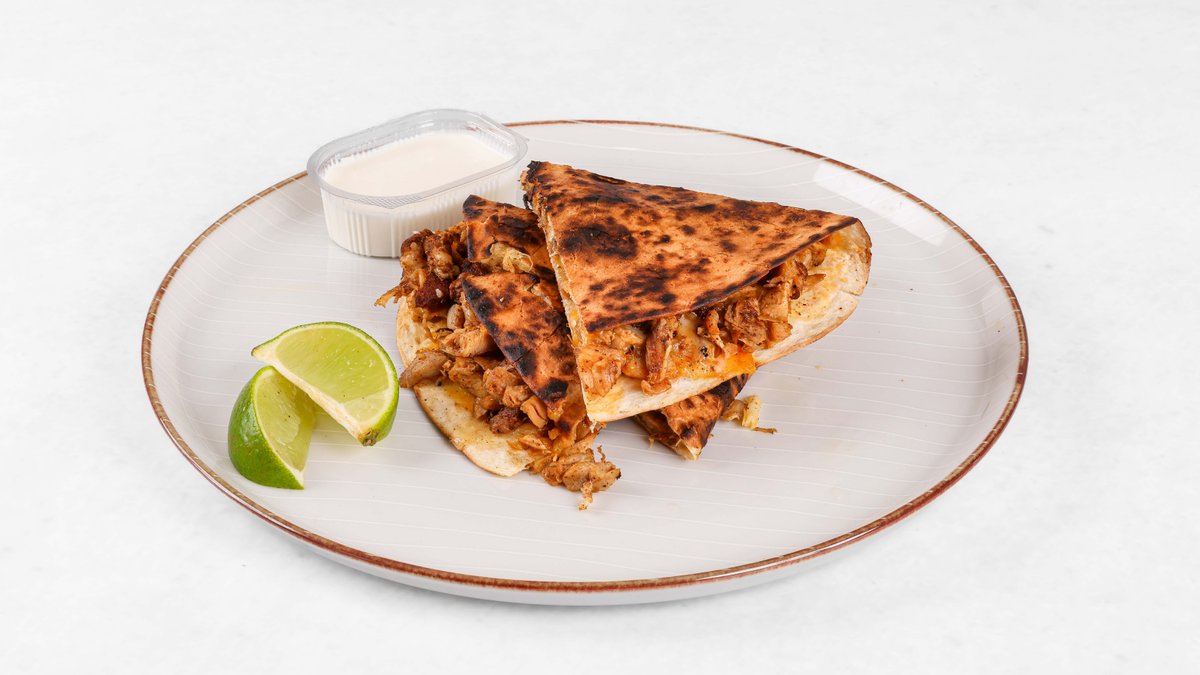 Tortilja, piščančje stegno na žaru, nariban sir, čebula