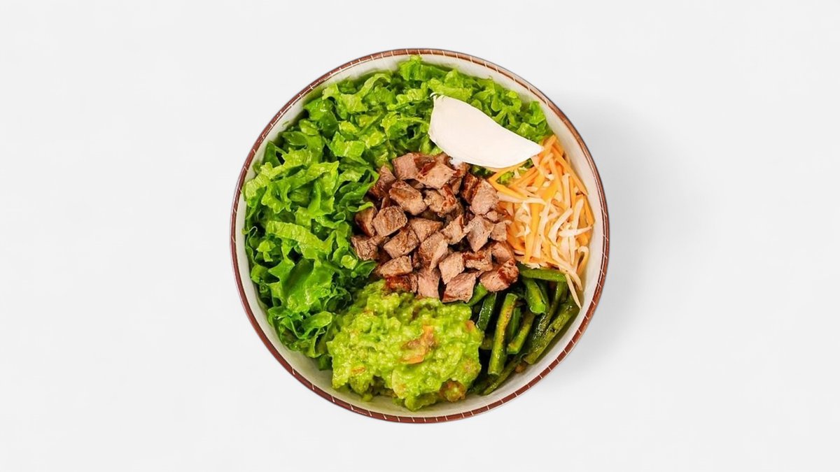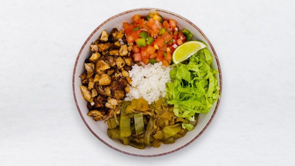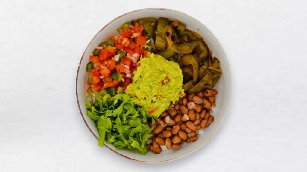 Sestavi svojo skledo: izberi za osnovo riž ali mlado špinačo, izberi beljakovine, zelenjavo, salse in dodatke po želji. Skleda je privzeto pripravljena s pinto fižolom, žar zelenjava (fajitas), svež paradižnik z limeto (pico de gallo), solato in zeleno salso.