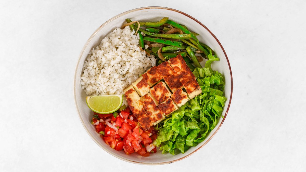 Riž, pečen sir za žar, žar zelenjava (fajitas), svež paradižnik z limeto (pico de gallo), zelena salsa, solata