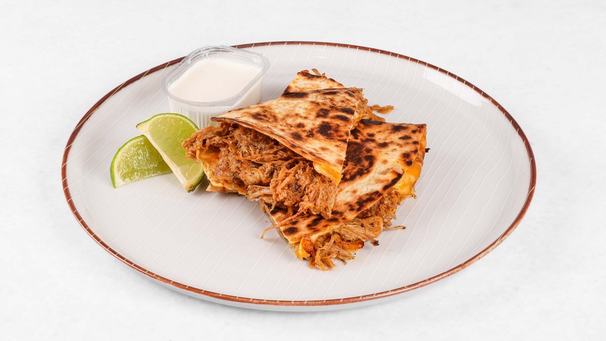 Tortilja, natrgana svinjina (carnitas), nariban sir, čebula