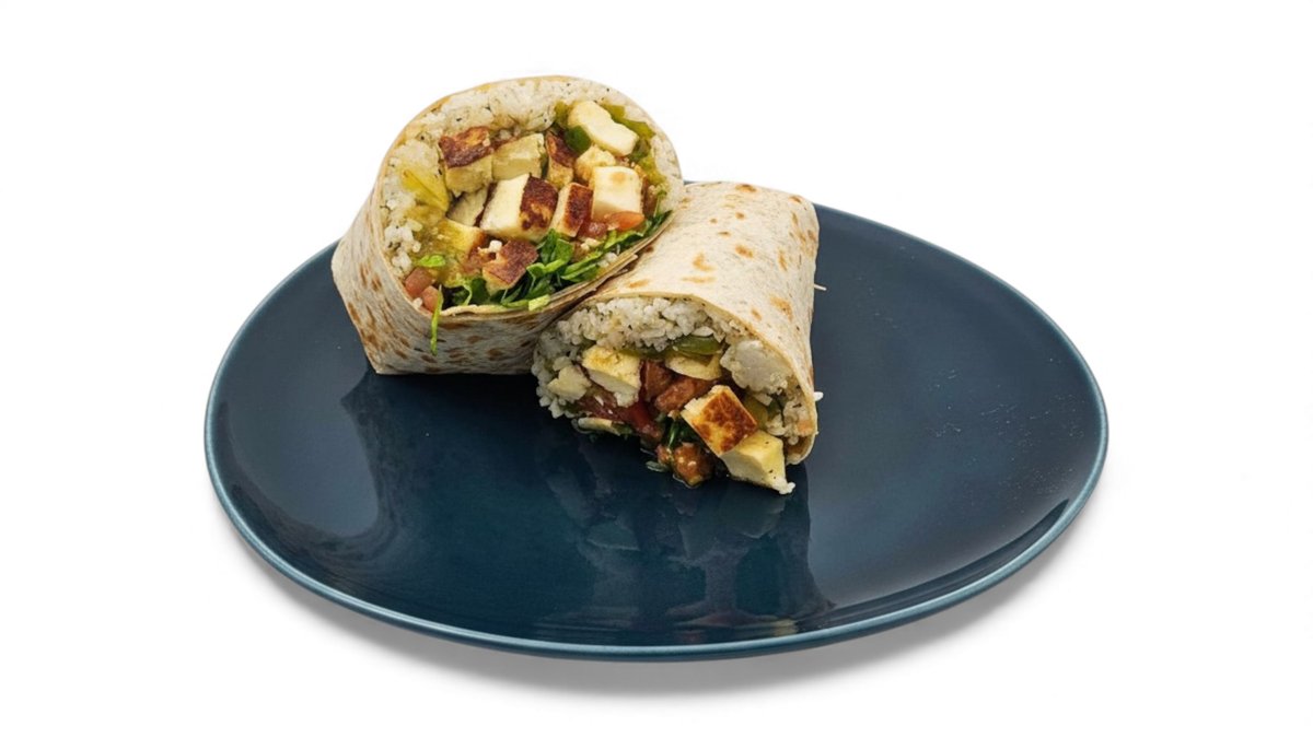 Tortila, riž, pečen sir za žar, žar zelenjava (fajitas), svež paradižnik z limeto (pico de gallo), zelena salsa, solata