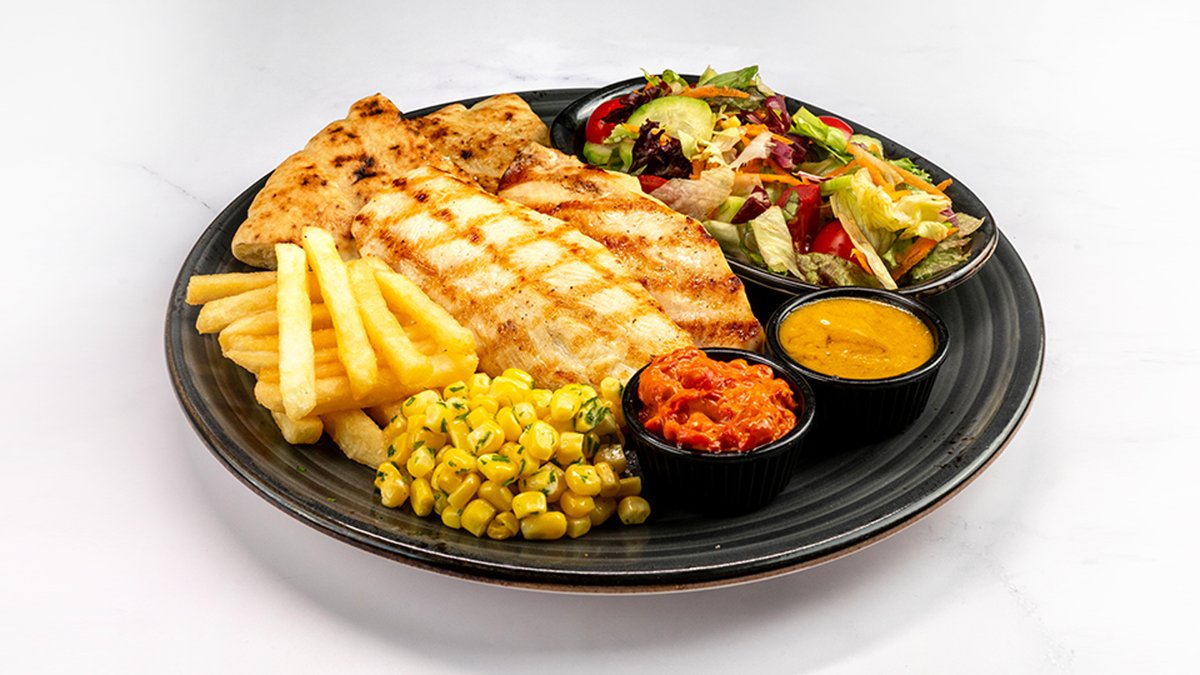 Piščančji file, vitaminska solata s češnjevim paradižnikom, kumaro in korenčkom, pomfrit 100 g, koruza, gorčično-medena omaka, domači ajvar, lepinja V ceno jedi je vštet znesek 0.40 eur za biorazgradljivo embalažo