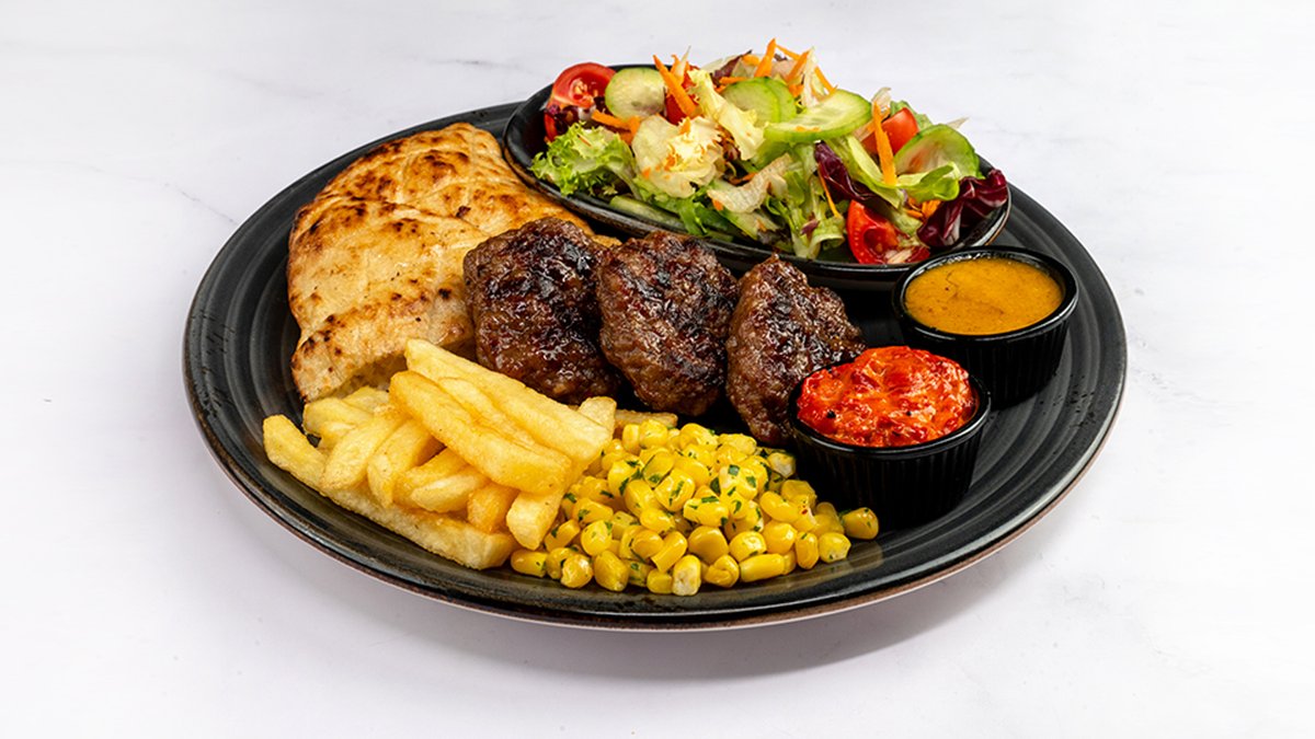 20 čevapčičev, klobasa s sirom 250 g, gurmanska pleskavica 300 g, pikantni odščipanci 250 g v omaki iz kajmaka, piščančje krpice 250 g v omaki iz kajmaka, čebula, drobljena paprika, urnebes, kajmak, pečeni krompirjevi krhlji 200 g s sirom, lepinja V ceno jedi je vštet znesek 0.40 eur za biorazgradljivo embalažo