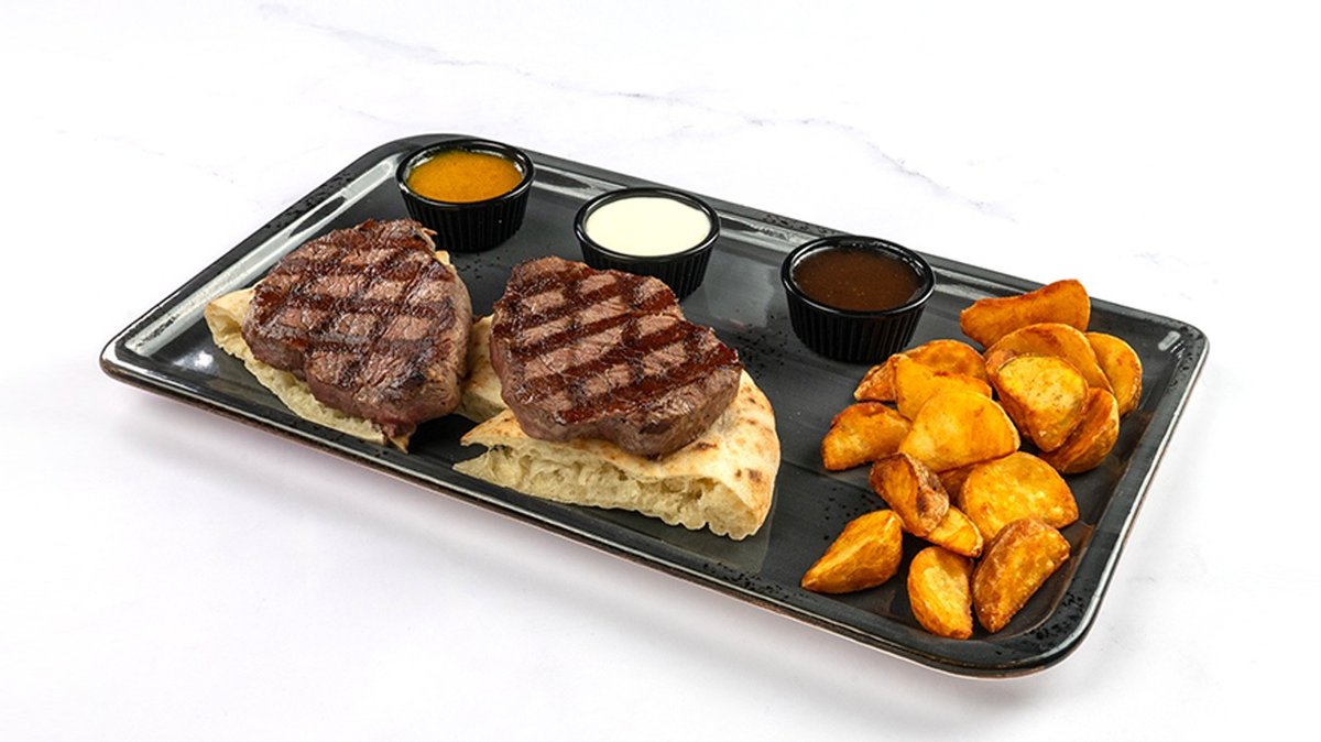 Junčje meso 250 g, pečeni krompirjevi krhlji 100 g, omaka iz balzamičnega kisa, gorčično-medena omaka, omaka iz kajmaka, lepinja V ceno jedi je vštet znesek 0.40 eur za biorazgradljivo embalažo