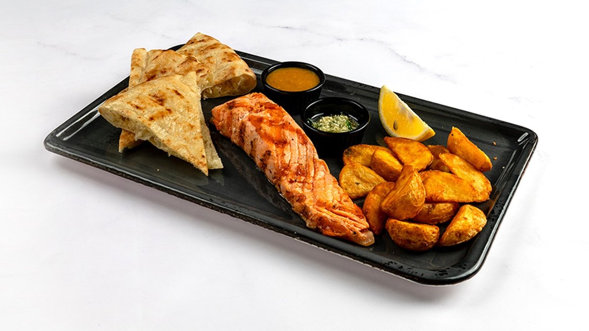 Losos steak 200 g, pečeni krompirjevi krhlji 100 g, senf/med sos, marinada, lepinja V ceno jedi je vštet znesek 0.40 eur za biorazgradljivo embalažo