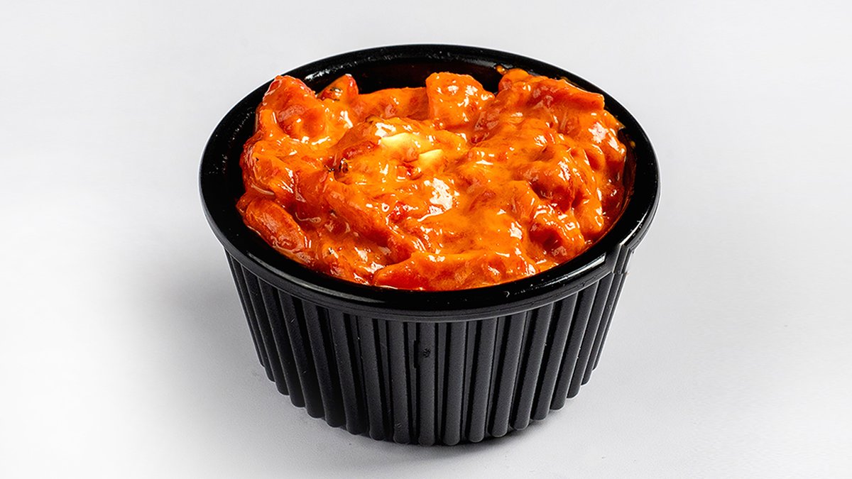 Marinirano piščančje meso 250 g, ribani sir, omaka iz kajmaka, lepinja, drobljena paprika V ceno jedi je vštet znesek 0.40 eur za biorazgradljivo embalažo