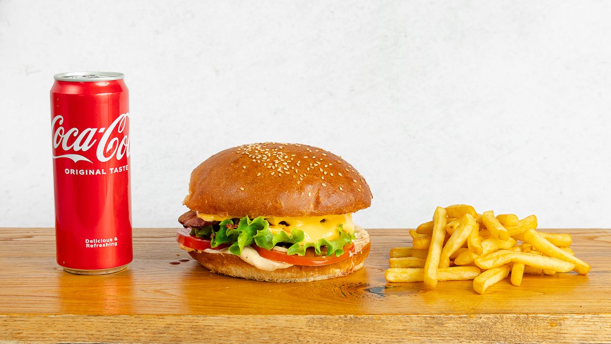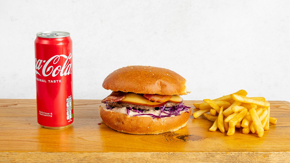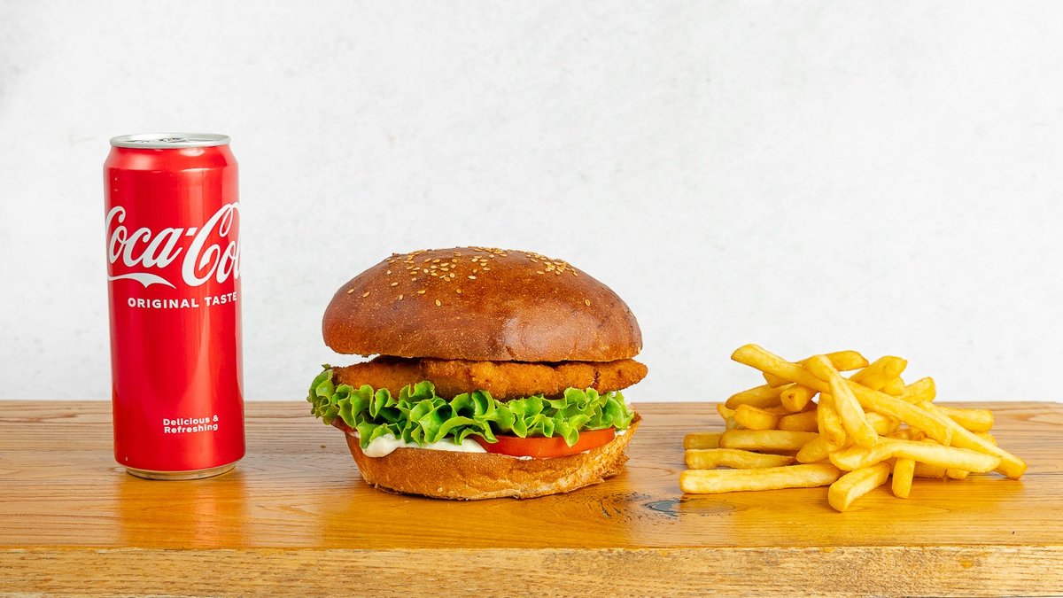 Fried chicken burger with fries and Coca-Cola 0.33 l
