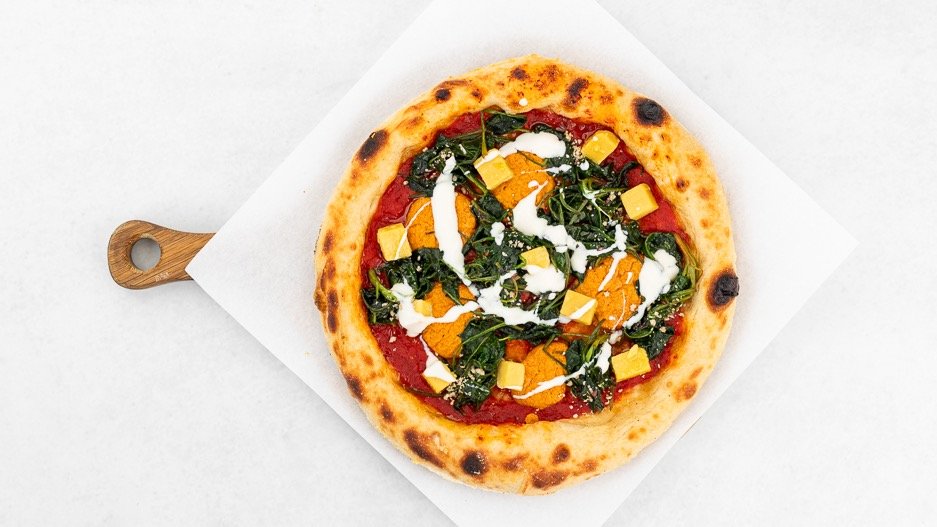 Polnozrnato testo s podaljšano fermentacijo, paradižnikova omaka, krema iz sončničnih semen, marinirana špinača, fermentiran čičerikin blok CHIKO v slanici, sojin jogurt, pražena mleta semena in ekstra deviško olivno olje.