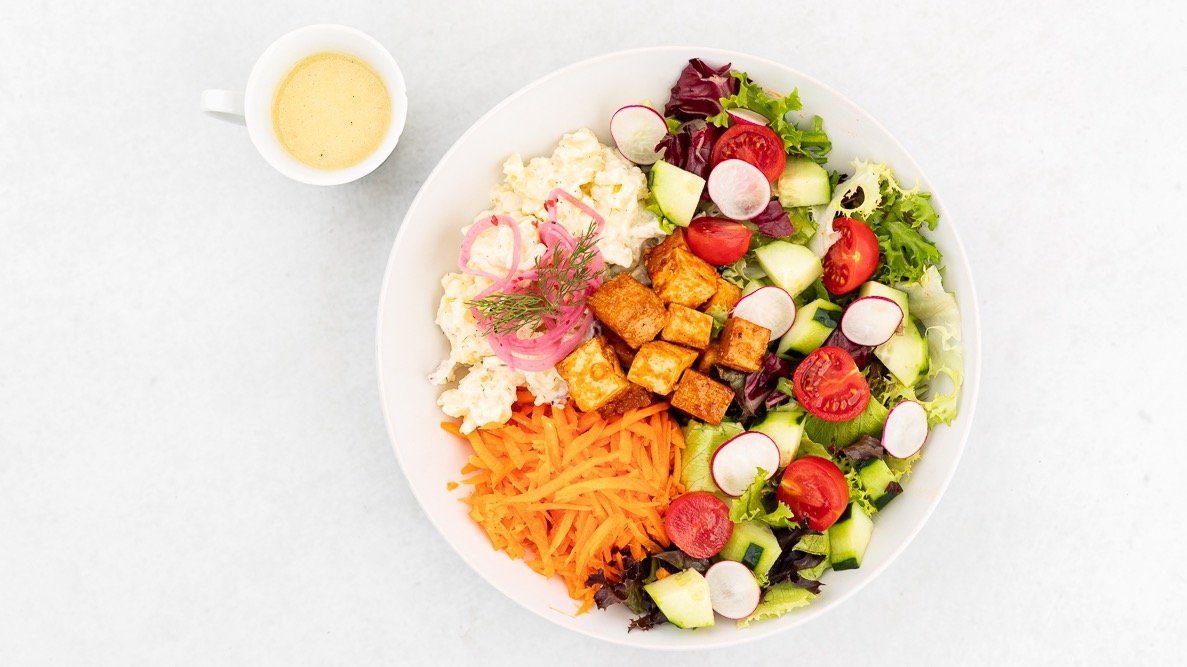 Krompirjeva solata, glaziran dimljen tofu, sezonska solata, sezonska zelenjava, korenje, redkev, okisana rdeča čebula, gorčični preliv.