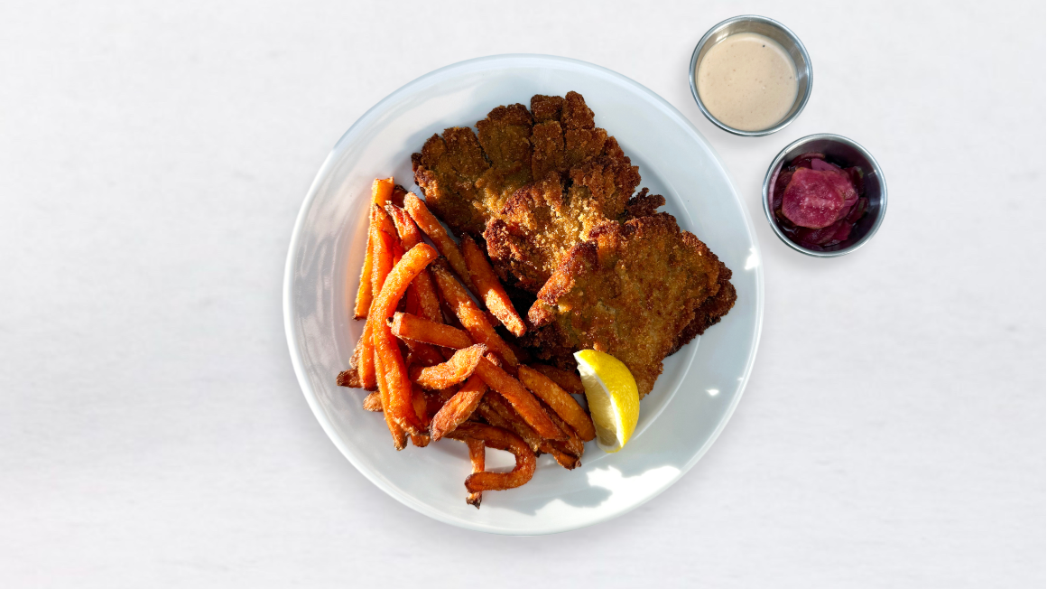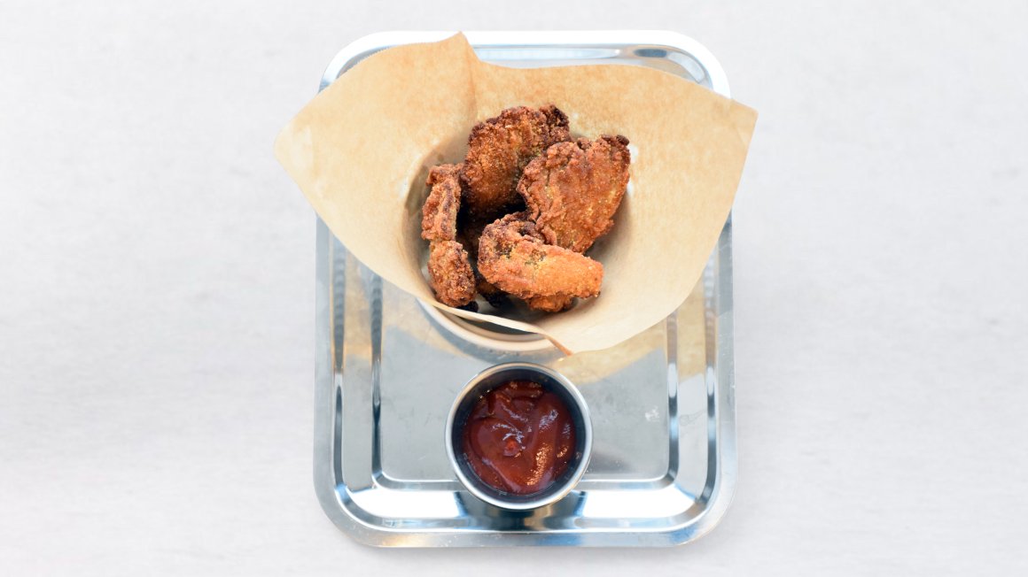Paniran bukov ostrigar, koktejl omaka, ocvrt sladki krompirček, hišni ferment.