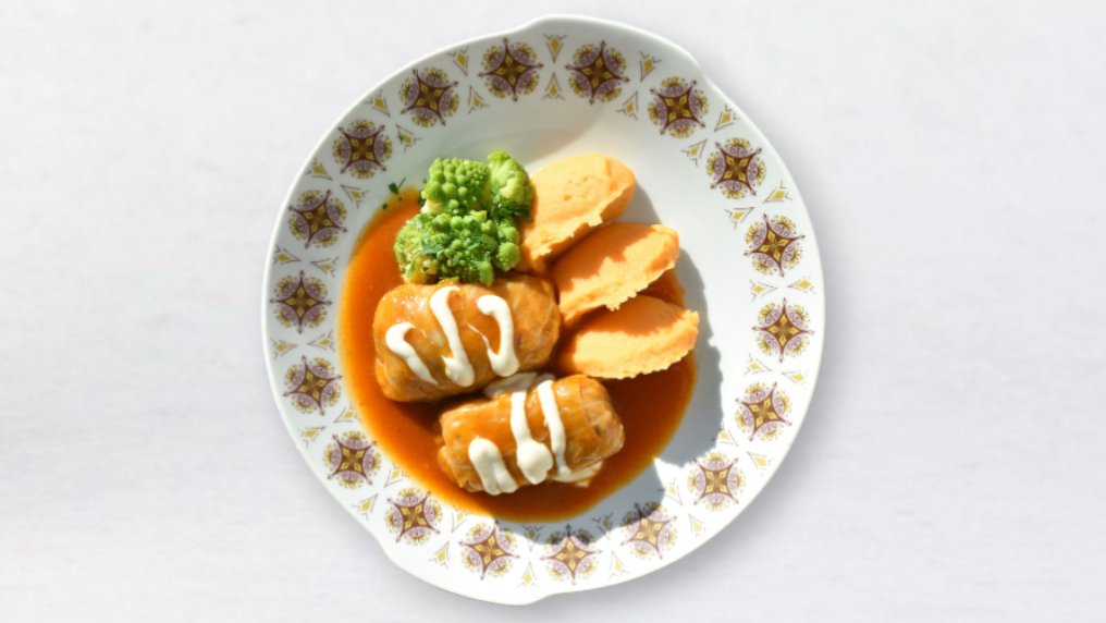 Sarme polnjene z drobljencem iz Kojibara (fermentiran ječmen, sončnične beljakovine in kvinoja) in rižem v omaki, pire iz sladkega krompirja, pečeni romanesco, sojin jogurt