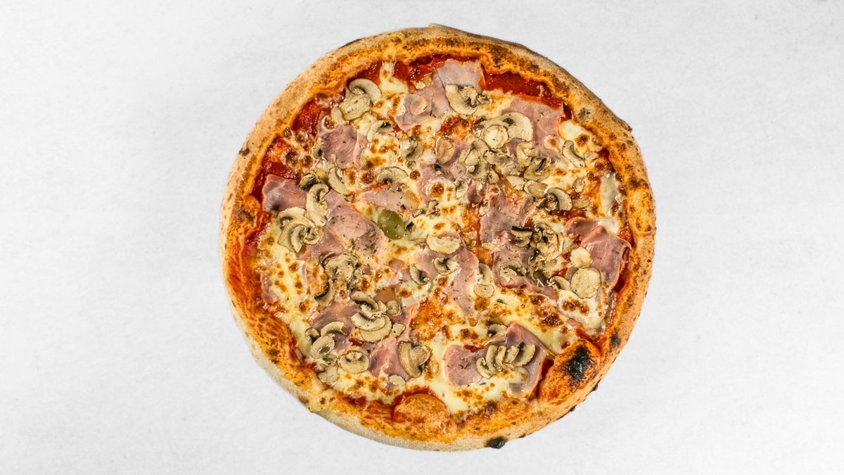 Pelati, mocarela, kuhan pršut, gobe, origano, oliva