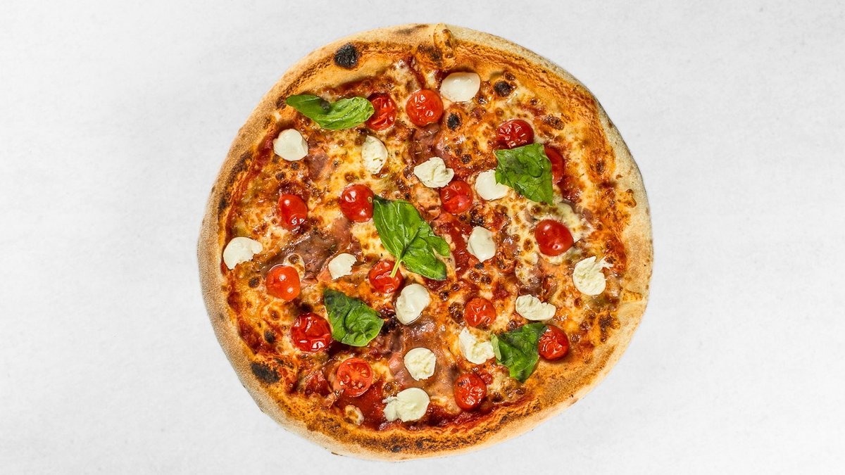 Pelati, mozzarella, pečen pršut, češnjev paradižnik, bazilika, mocarela buffala, balzamična krema, origano, oliva