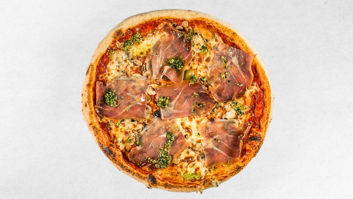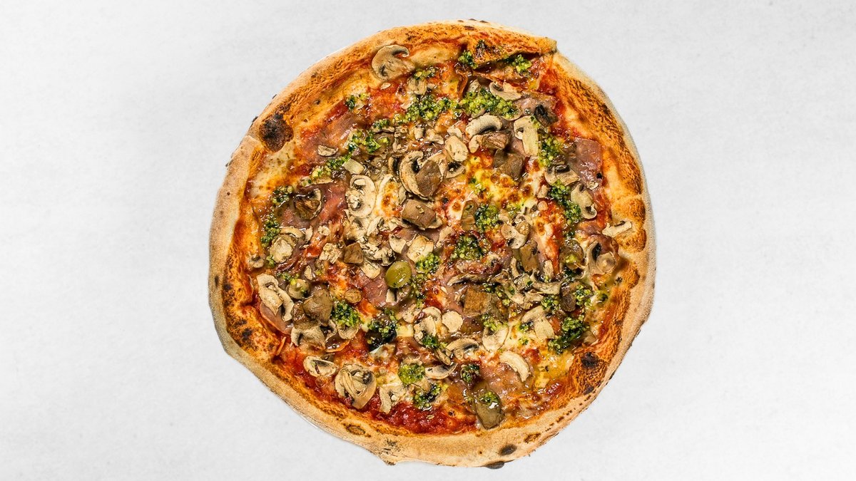 Pelati, mozzarella, gobe, pršut, tržaška omaka, origano, oliva