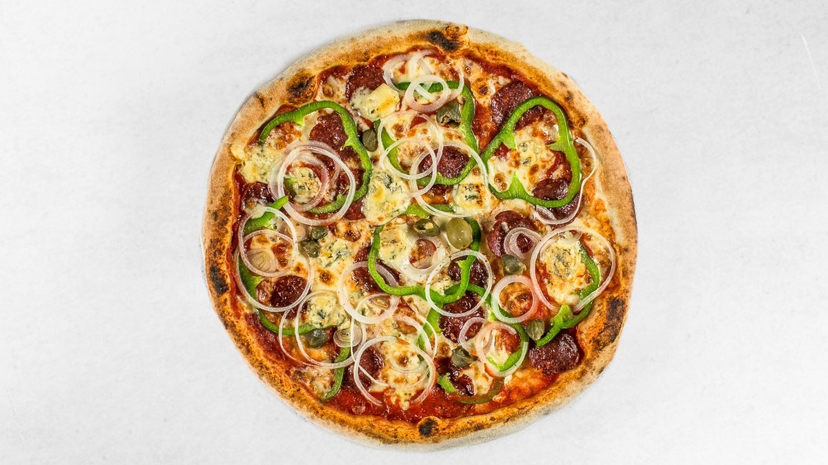 Pelati, mozzarella, goveja suha salama, gorgonzola, čebula, paprika, kapre, origano, oliva