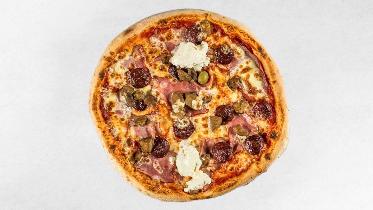 Pelati, mozzarella, goveja suha salama, hrenovke, gobe, pršut, kisla smetana, origano, oliva