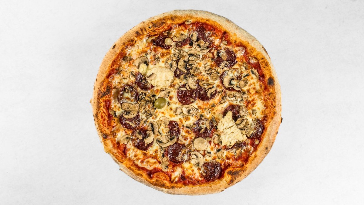 Pelati, mozzarella, gobe, čebula, panceta, feferoni, origano, oliva