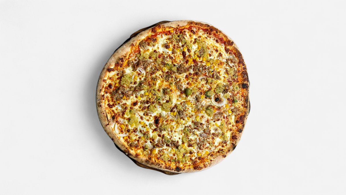 Pelati, mozzarella, tuna, čebula, tržaška omaka, koruza, origano, oliva