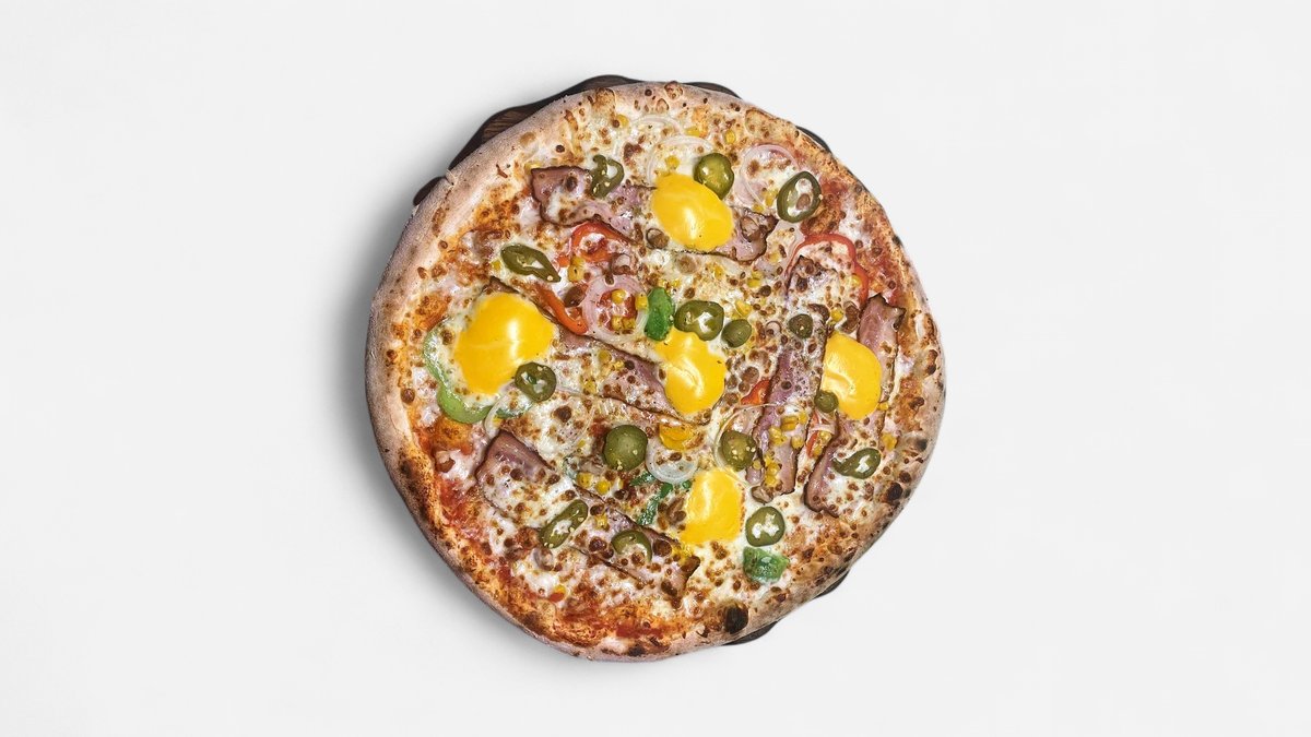 pelati, mozzarella, slanina, nacho sir, koruza, paprika, fižol, čebula, feferoni, origano, oliva