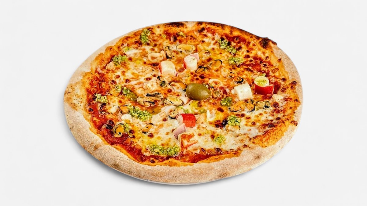 pelati, mozzarella, školjke, morski sadeži, tržaška omaka, origano, oliva