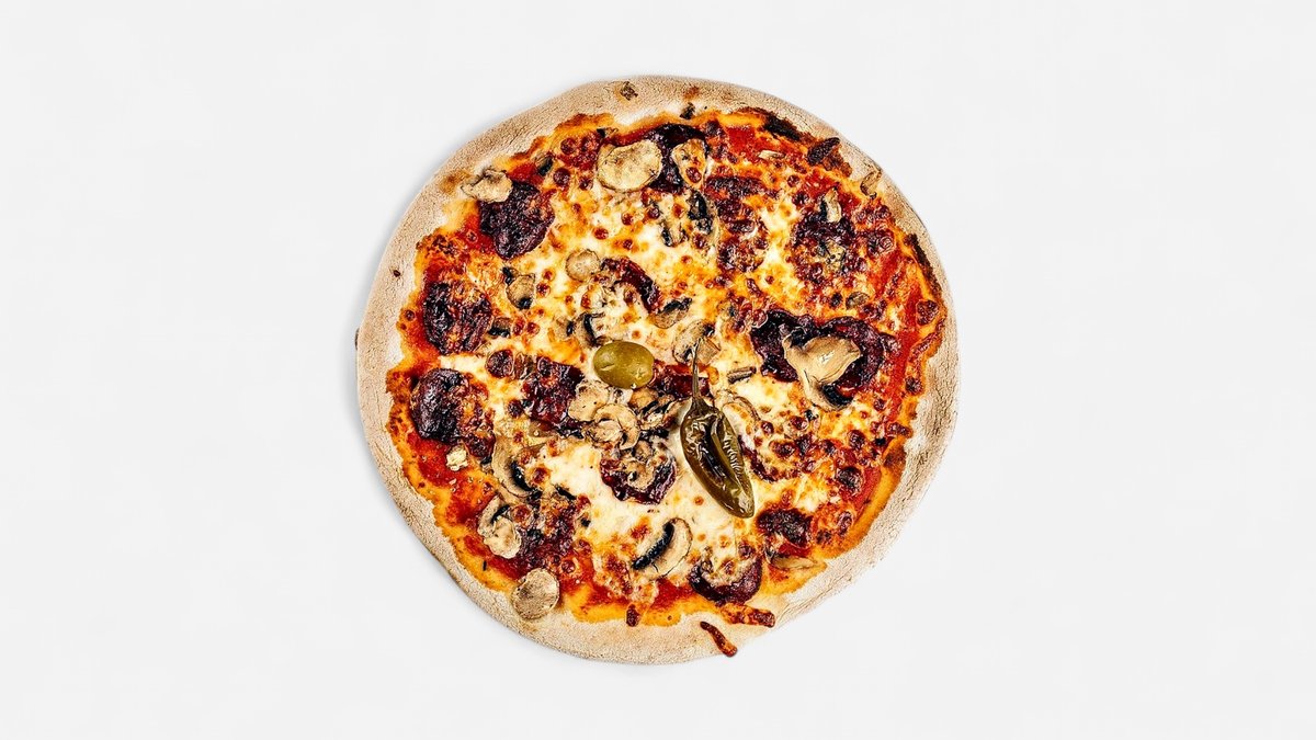 pelati, mozzarella, kulen, gobe, feferoni, origano, oliva