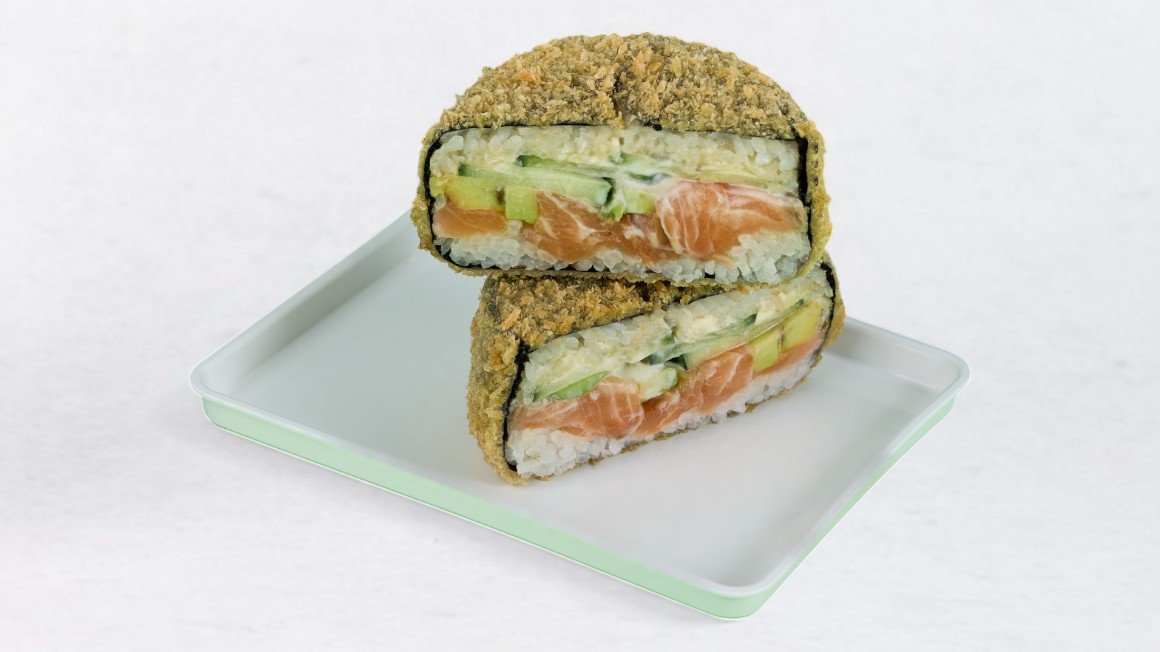 Riž, nori, kremni sir, kumara, omleta, testeni sloj, panko drobtine, začinjeni losos, rakov meš
