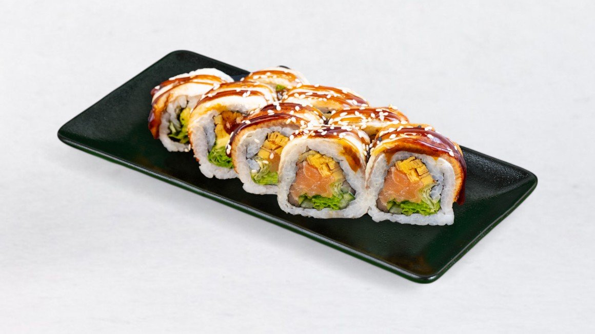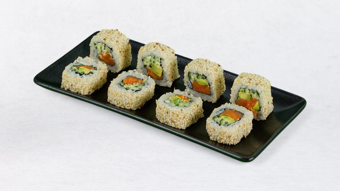 Riž, nori, losos, avokado, majoneza, tobiko, začinjena omaka, testo, panko drobtine V ceno jedi je všteto doplačilo 0.50 eur za biorazgradljivo embalažo