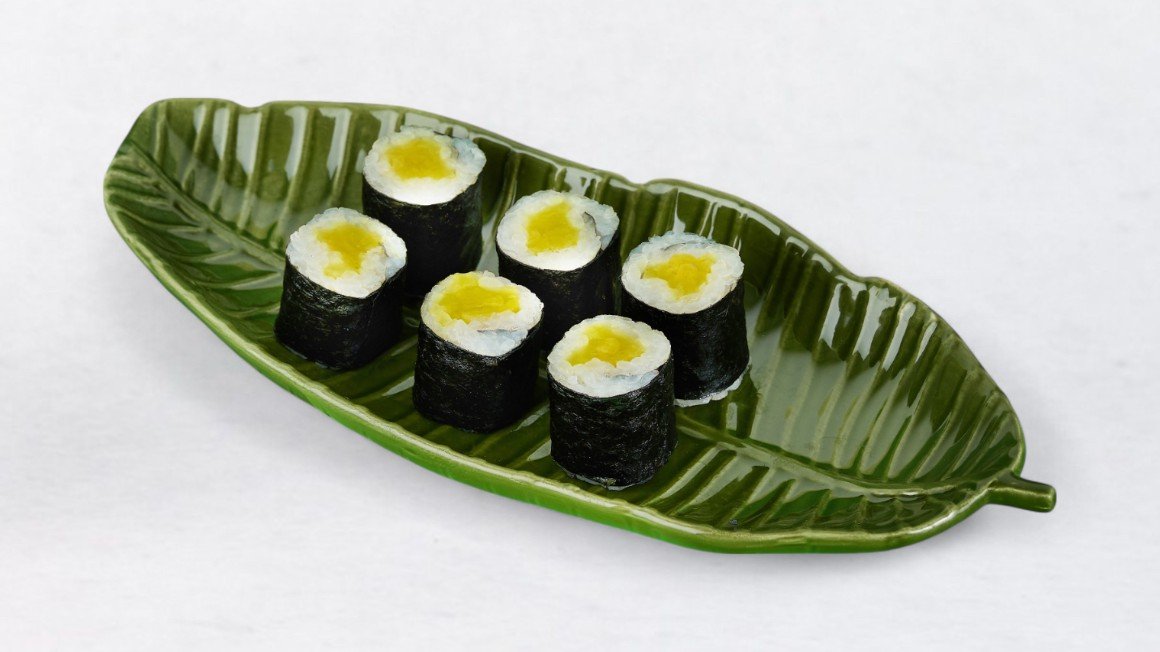 Riž, nori, losos, omleta, avokado, kumara, ledena solata, jegulja, unagi omaka, črno-bele sezamove semenke