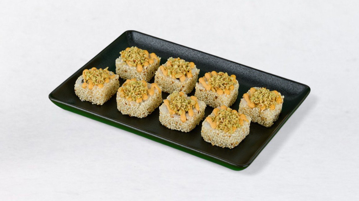 Riž, nori, kremni sir, losos, mango, bele sezamove semenke, začinjena omaka, wasabi arašidi