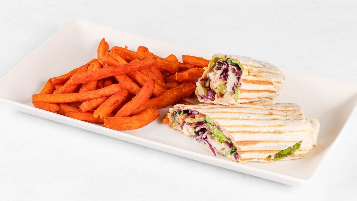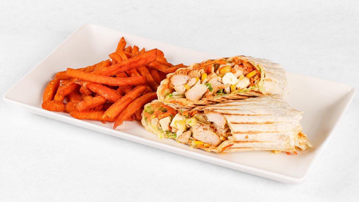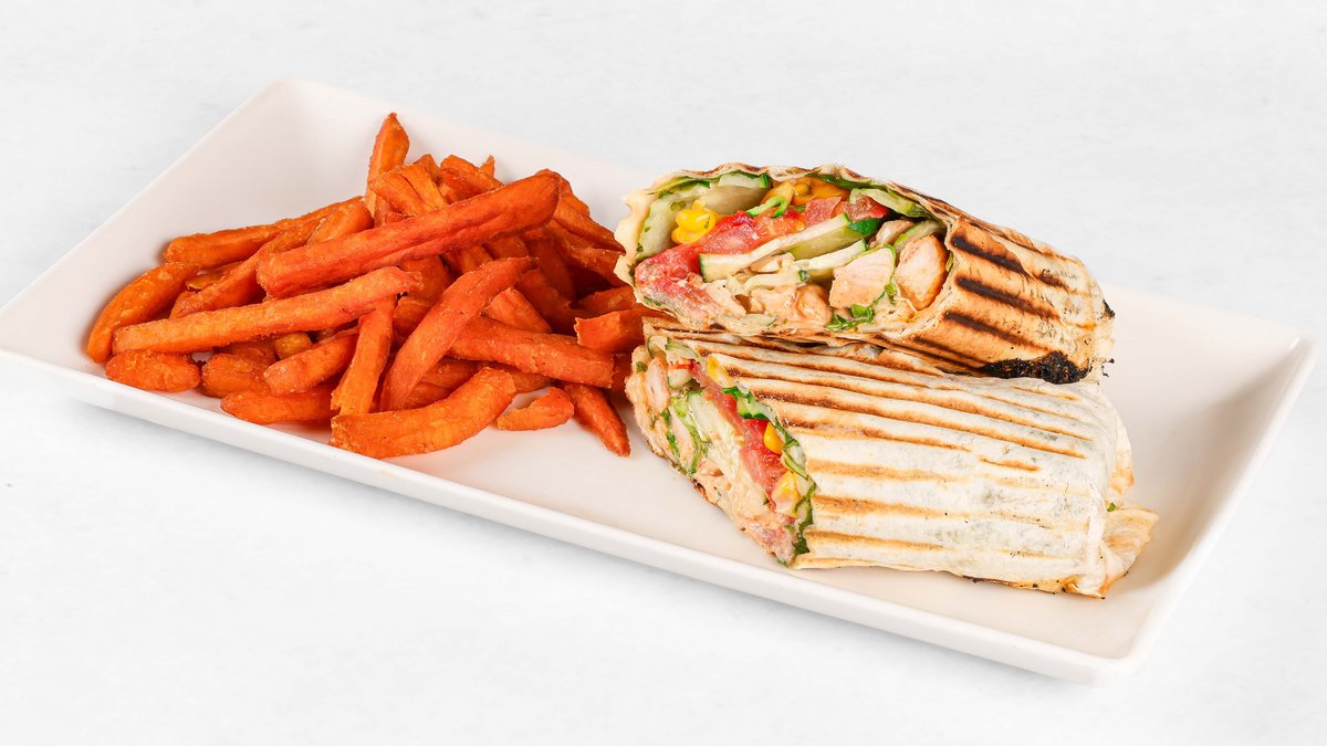 Paradižnik, kumara, feta, črne olive, krompirček v wrapu, jogurtova omaka, osnova po izbiri, krompirček