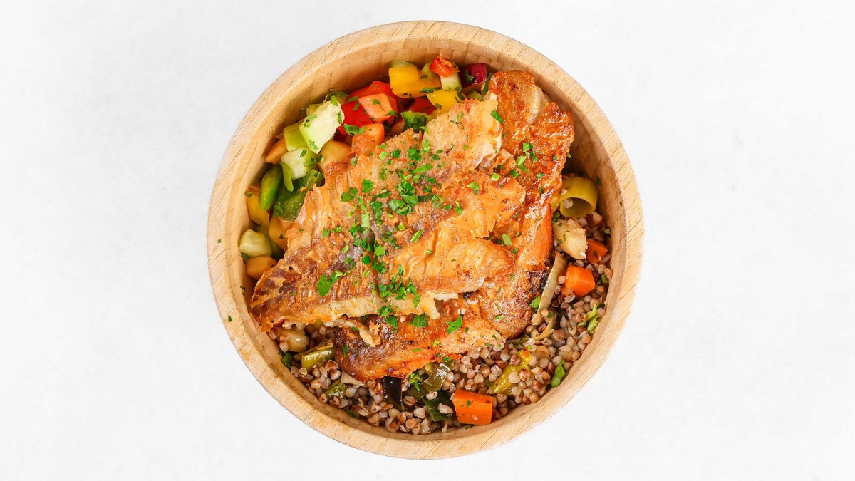 Sveže pečen file škarpene, ajdova kaša s svežo zelenjavo in vinegrette omako