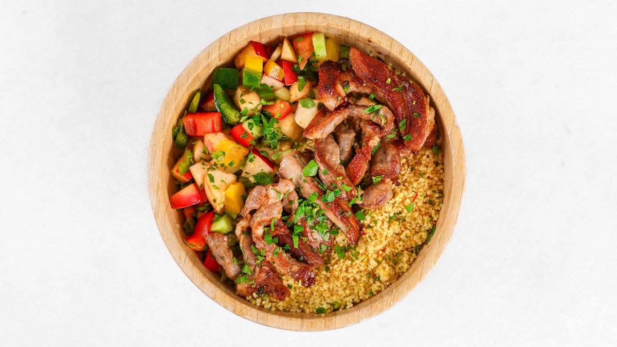 Mariniran svinjski vrat, kuskus s svežo zelenjavo in vinegrette omako
