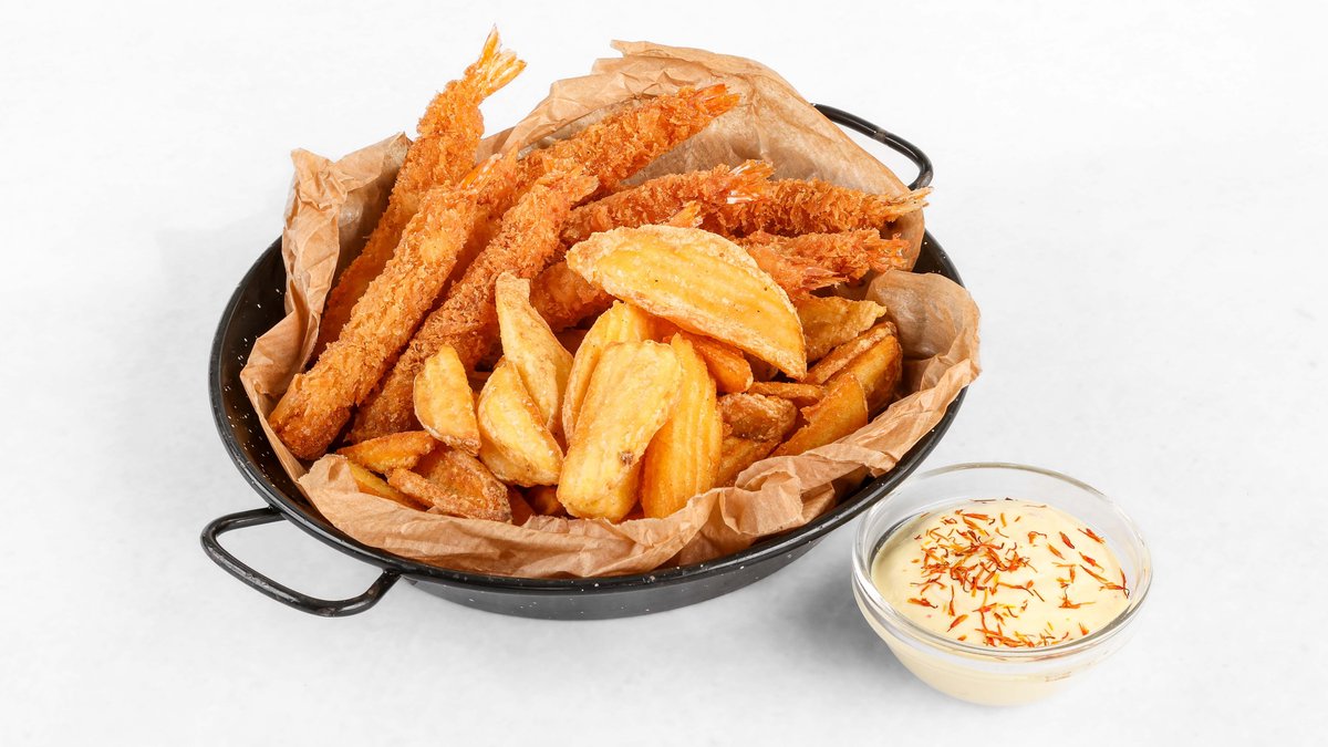 Kozice v panko hrustljavčku, postrežene s krompirčkom in hišno salso