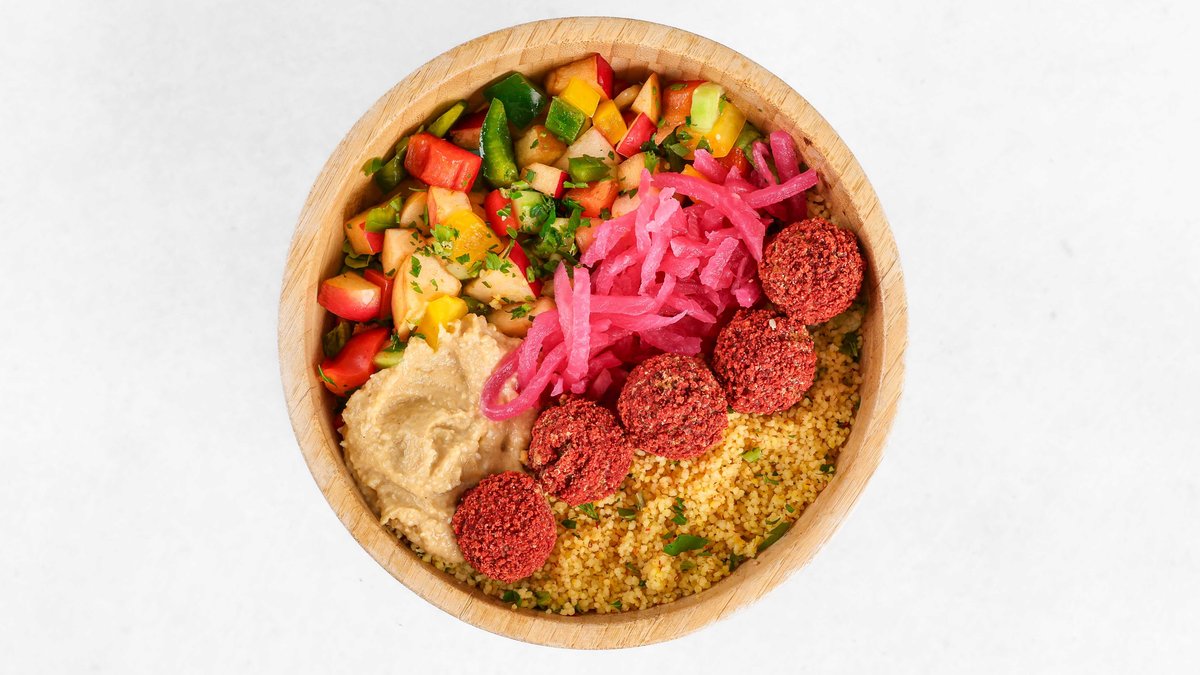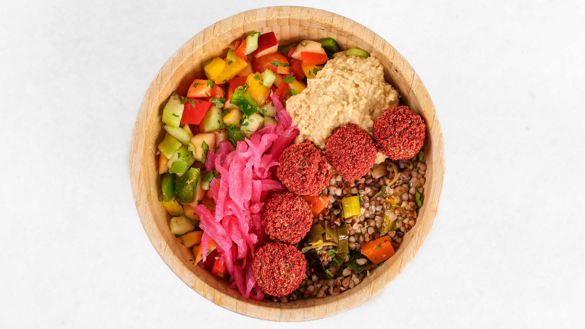 Zlato zapečeni falafelčki z živahno zelenjavo in tahini-hummus omako