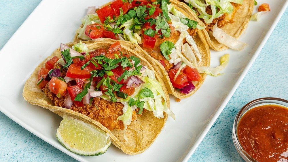 3x koruzna tortilja, hrustljavo ocvrti fileji osliča, trakci solate ledenke z limeta kremo, pico de galo, koriander, salsa