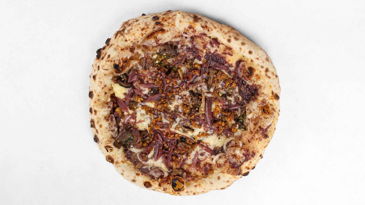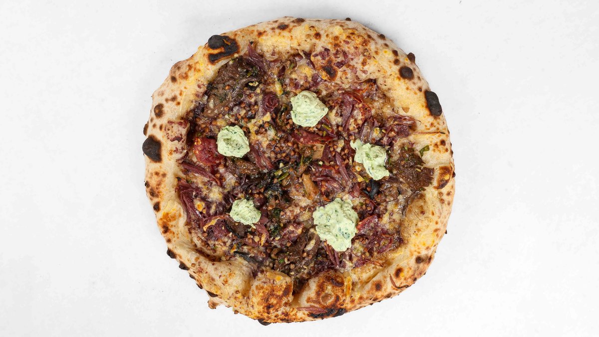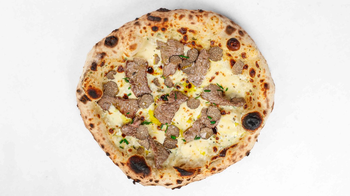 Taleggio krema, mozzarella Fior di Latte, črni tartuf, zeliščno olje, popečena govedina V ceno jedi je všteto doplačilo 0.50 eur za biorazgradljivo embalažo