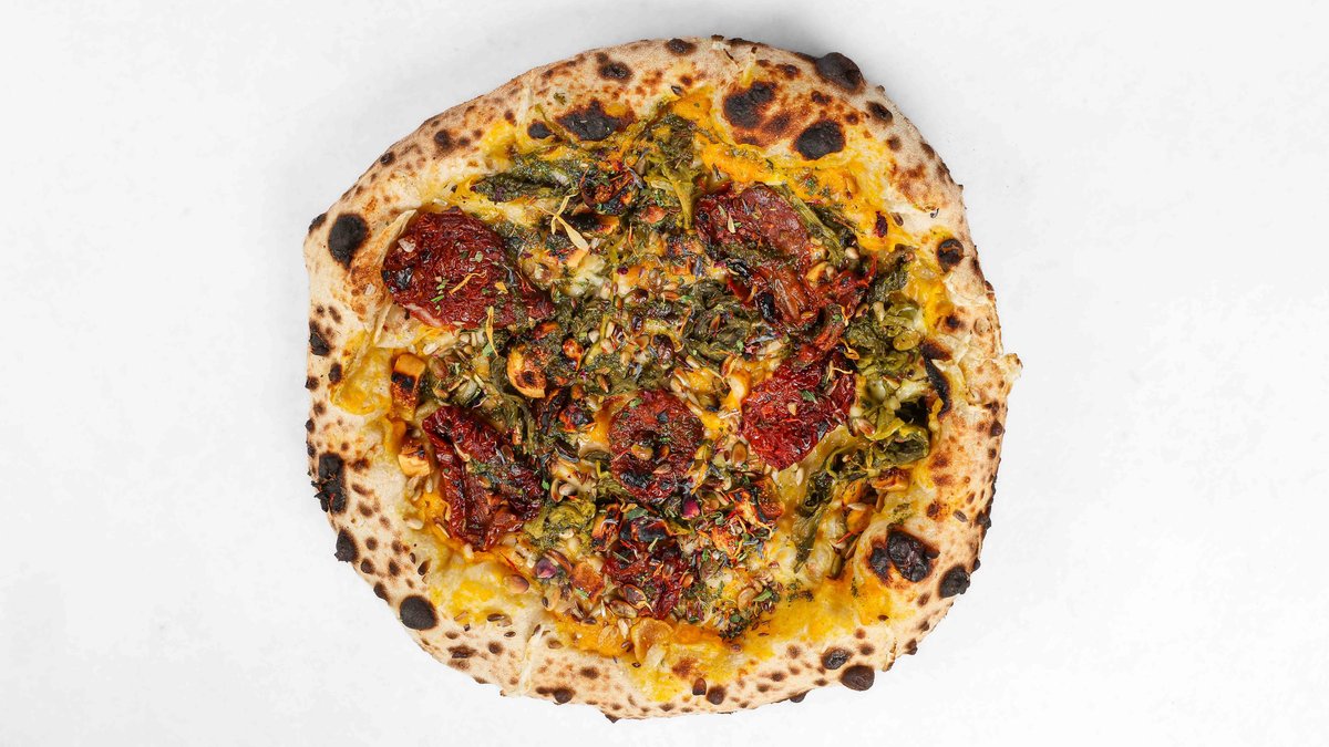 Pelati Gustarosso, rdeča čebula, koruza, bučna semena, posušeni paradižniki in veganska mozzarella V ceno jedi je všteto doplačilo 0.50 eur za biorazgradljivo embalažo