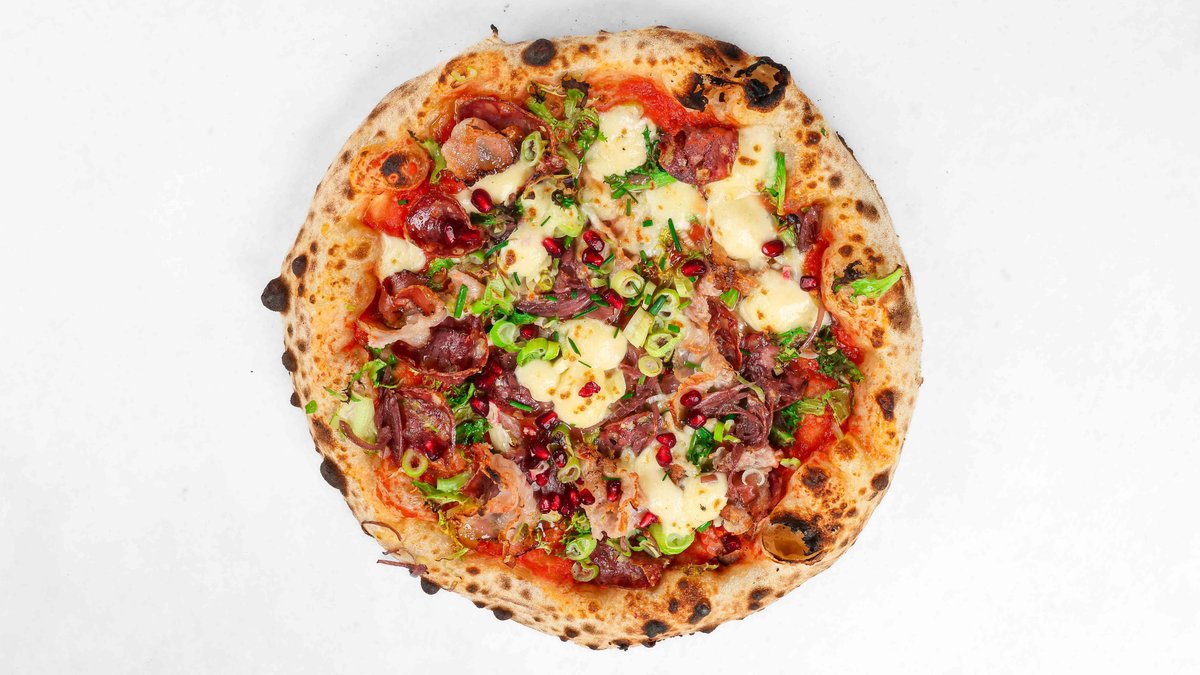 Pelati Danicoop Gustarosso, mozzarella Fior di Latte, porchetta, salama divjega prašiča, guanciale, okrasna endivja, mlada čebula, šalotka v Chiantiju, granatno jabolko, drobnjak V ceno jedi je všteto doplačilo 0.50 eur za biorazgradljivo embalažo