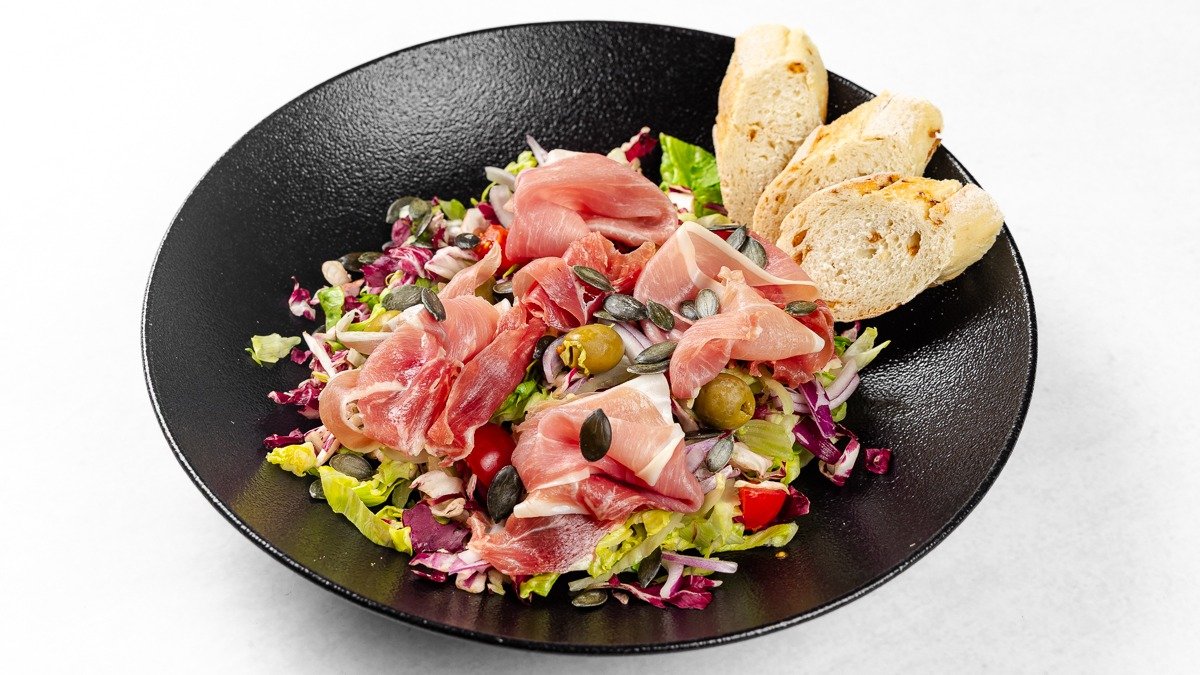 Pršut, mešana solata, olive, češnjev paradižnik, rdeča čebula, bučna semena V ceno jedi je všteto doplačilo 0.50 eur za biorazgradljivo embalažo