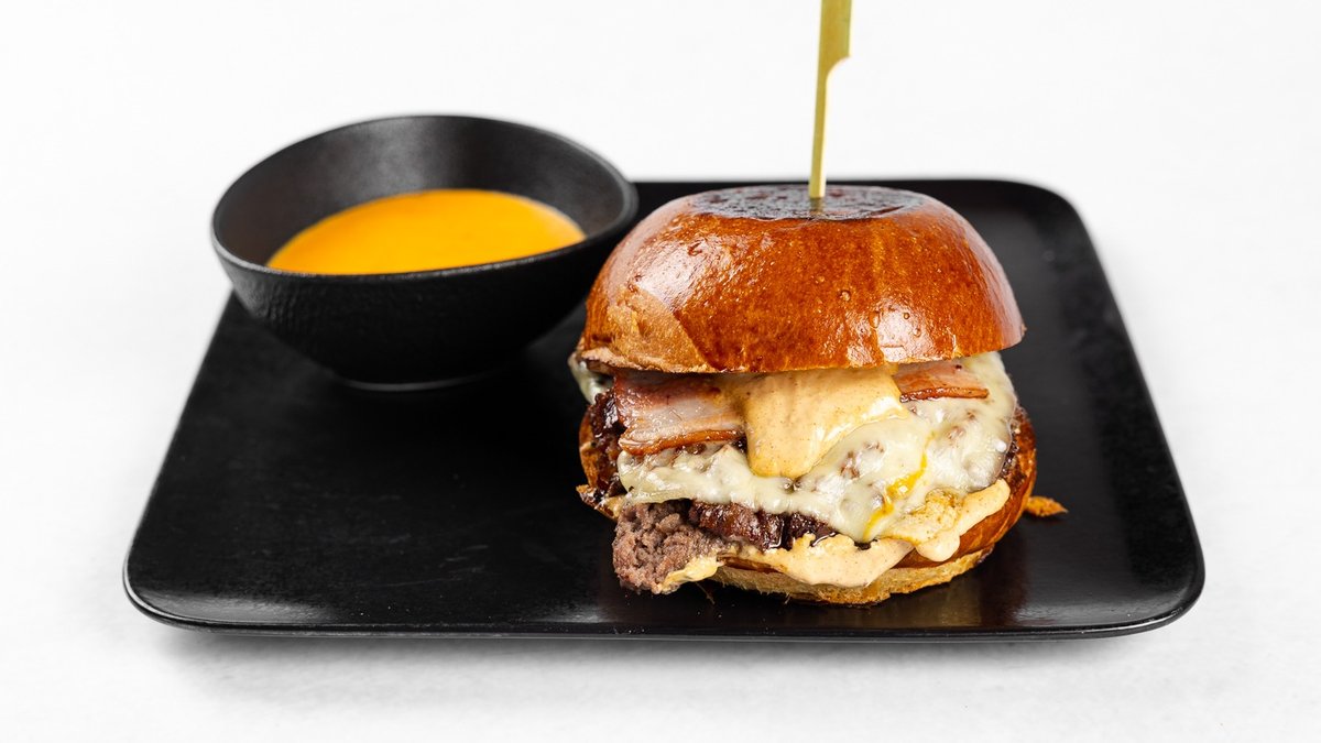 Naša bombetka, 2x80 g smash pleskavica, 2x slanina, edamec, tasty burger omaka in cheddar dip V ceno jedi je všteto doplačilo 0.80 eur za biorazgradljivo embalažo