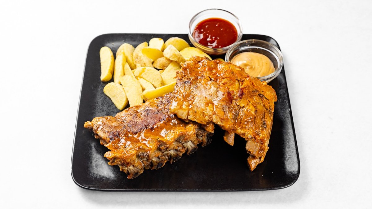 Spare ribs, krompirjevi krhlji, hišna burger omaka, hišna BBQ omaka V ceno jedi je všteto doplačilo 0.80 eur za biorazgradljivo embalažo