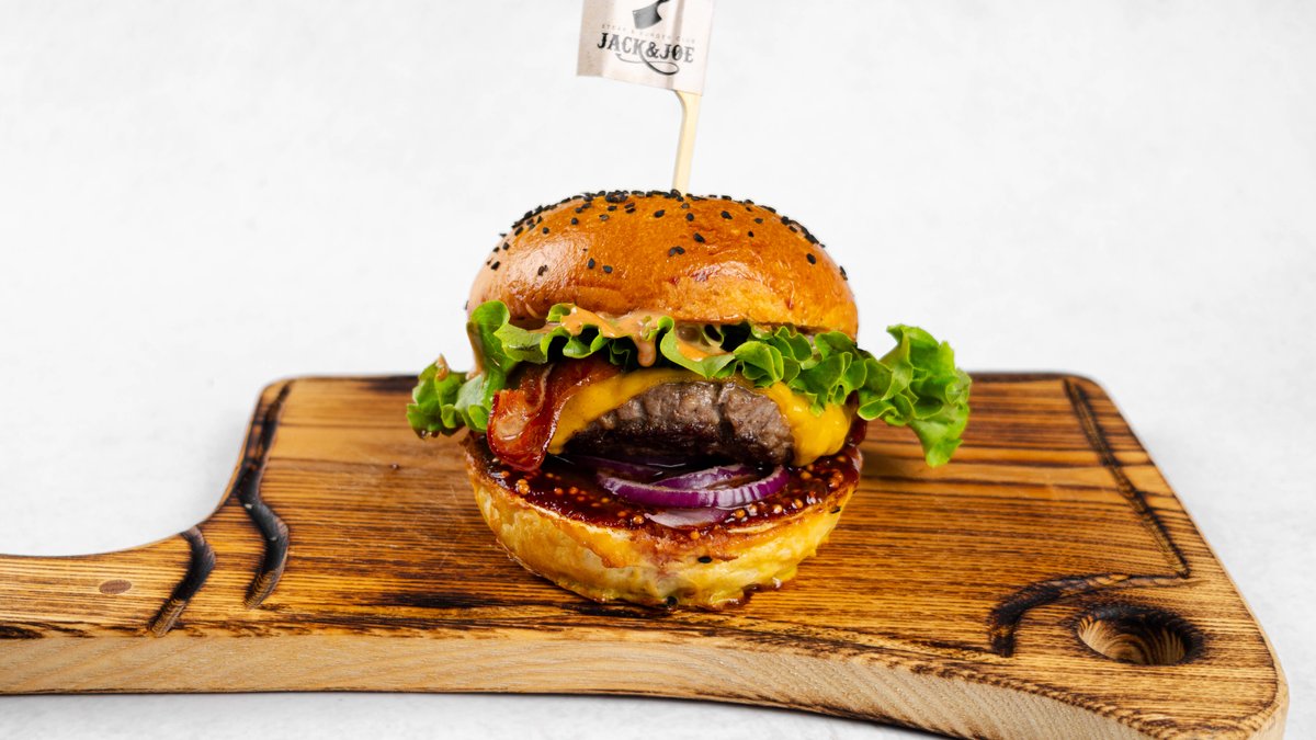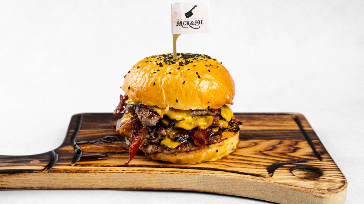 Hlebček, 2x "smash" hrustljava pleskavica iz zorjene slovenske govedine, 2x cheddar sir, 2x slanina, hišna omaka, popečena čebula, kisle kumarice V ceno jedi je všteto doplačilo 0.70 eur za biorazgradljivo embalažo