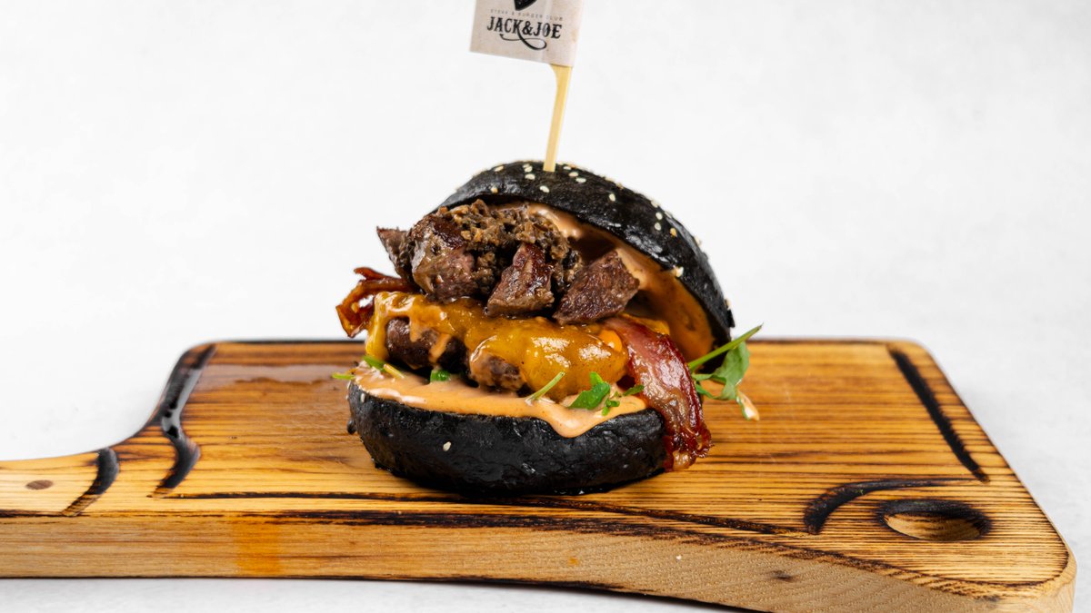 Črn hlebček, meso, rezine pljučne na žaru, tartufi, tartufata, cheddar sir, omaka, hrustljava slanina, omaka, rukola V ceno jedi je všteto doplačilo 0.70 eur za biorazgradljivo embalažo