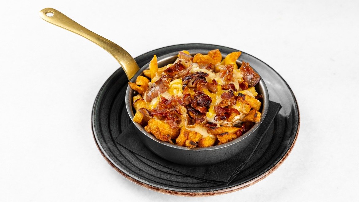 Črn hlebček, meso, "Bergkäse", dvojna slanina, rukola, ocvrta čebula, pomfri, omaka, injekcija cheddar sira in injekcija smokey BBQ omake V ceno jedi je všteto doplačilo 0.70 eur za biorazgradljivo embalažo