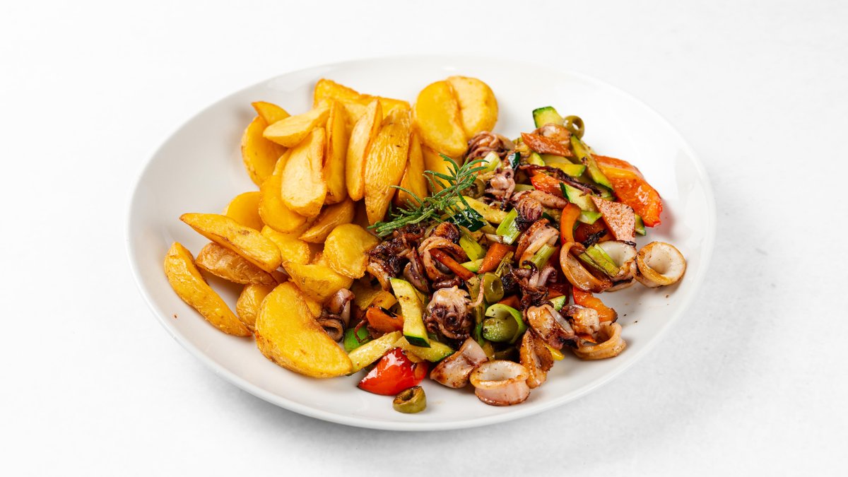 Lignji na žaru, popečena zelenjava, olive, krompirjevi krhlji V ceno jedi je všteto doplačilo 0.50 eur za biorazgradljivo embalažo