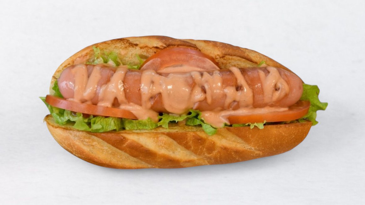 Kruh, hrenovka, salsa rosa, solata, paradižnik ter pijača.