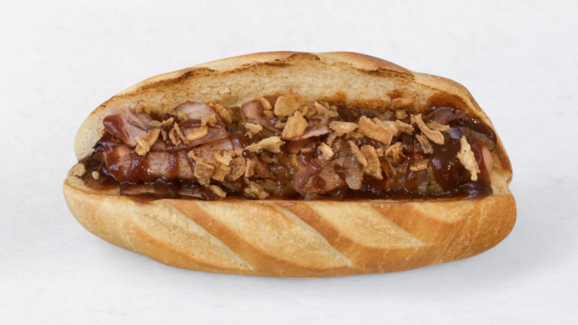 Kruh, hrenovka, bbq omaka, panceta, karamelizirana čebula, ocvrta čebula ter pijača.
