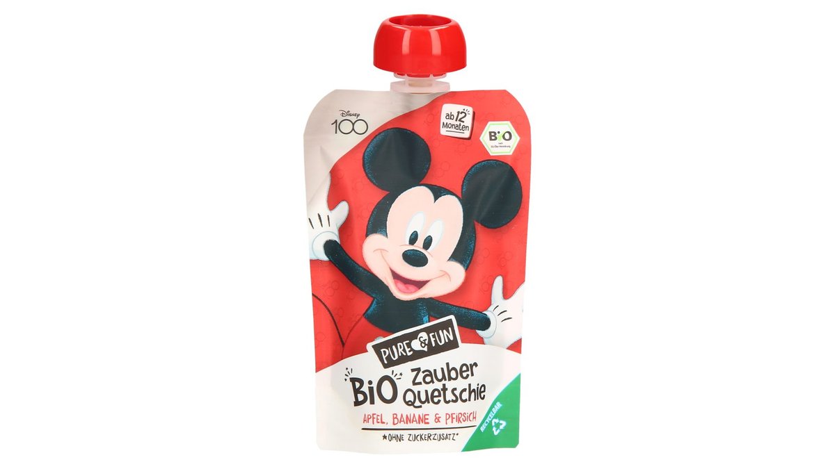 Bio sadni pire Micky iz jabolka, banane in breskve, Pure&Fun (100 g)
